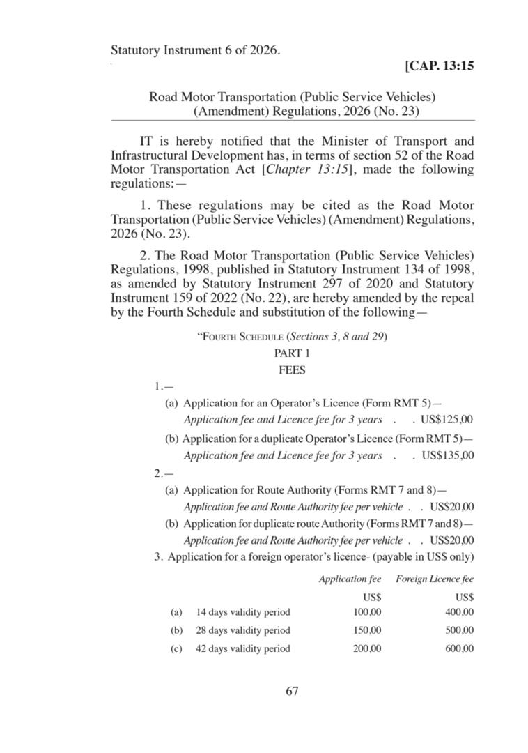 These include vehicle registration by the Central Vehicle Registry (CVR), licencing by the Zimbabwe National Road Authority (ZINARA), vehicle change of ownership procedures handled by CVR, ZINARA and the Zimbabwe Revenue Authority (ZIMRA), as well as parking fees and related traffic management charges by local authorities.
