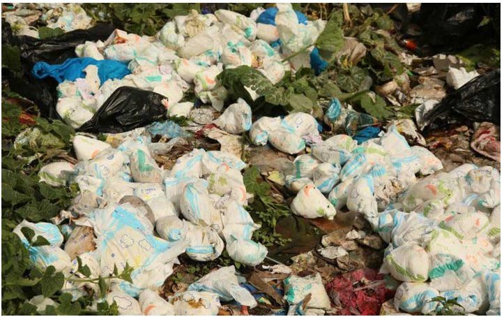 Discarded diapers are often seen piled in open spaces, along roadsides or dumped in streams, releasing harmful bacteria and polluting water sources.